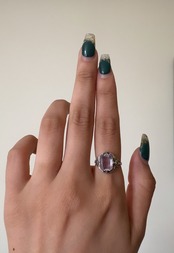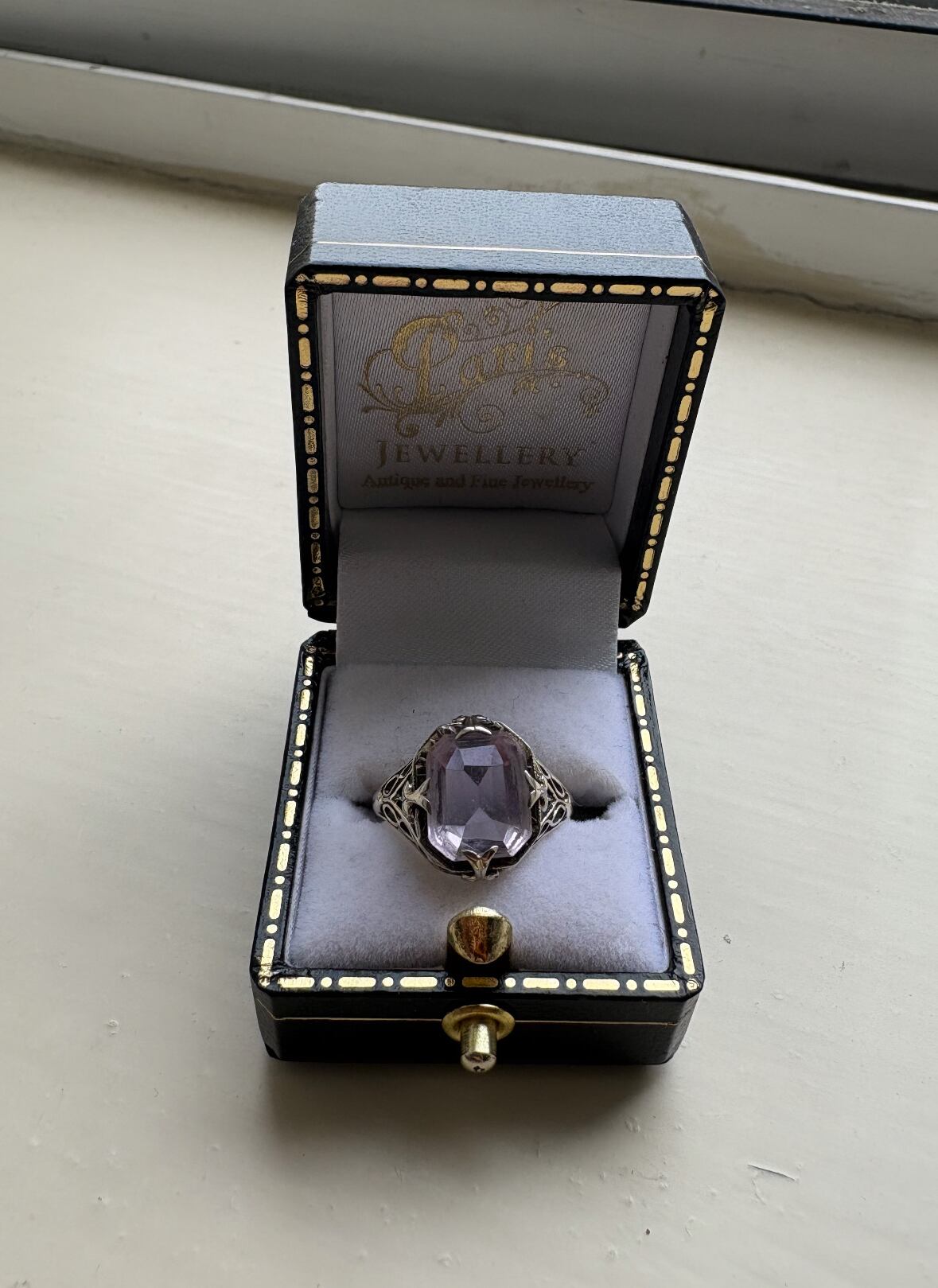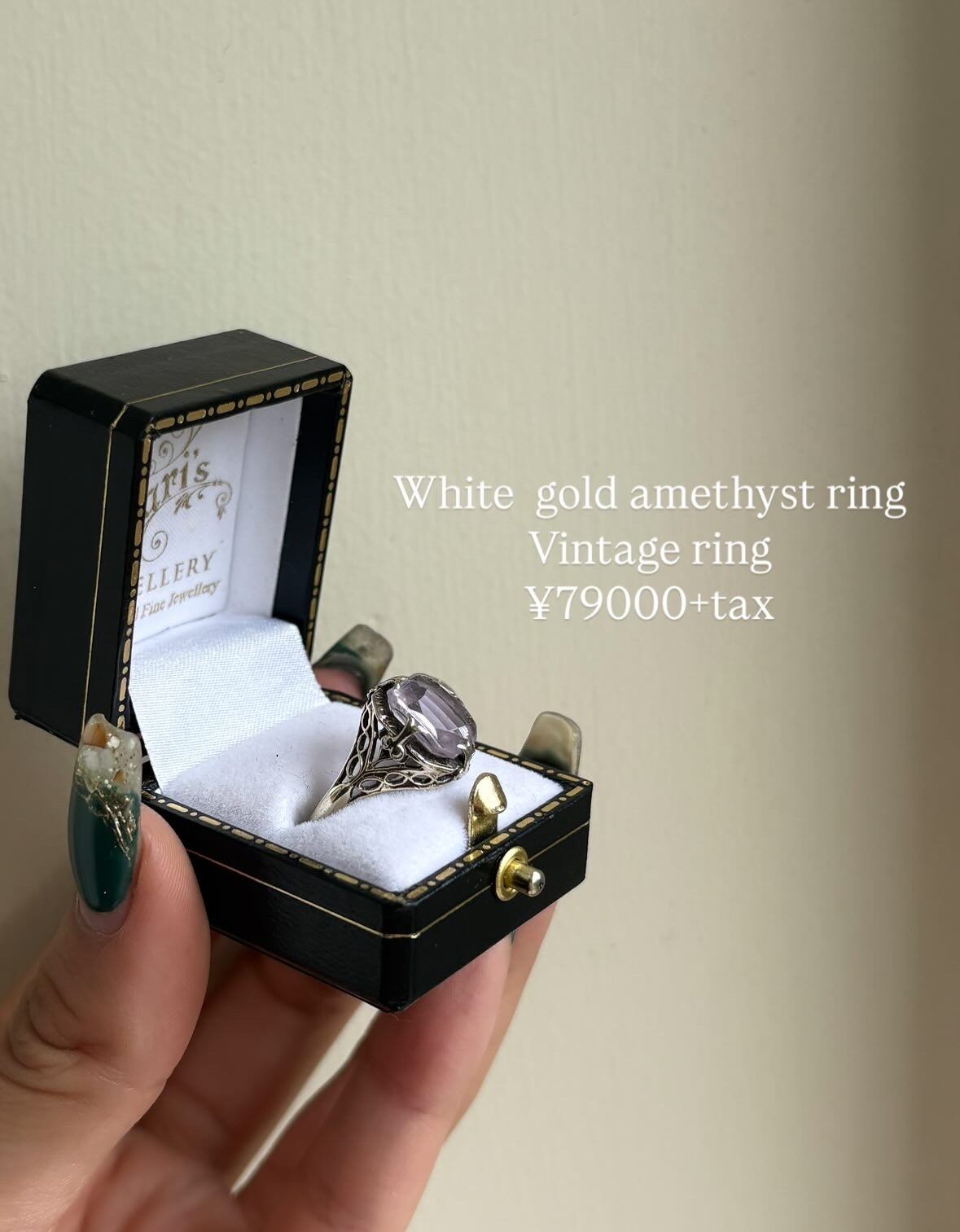 ヴィンテージホワイトゴールドに淡く透き通るようなアメジストをふんだんに使用したリングになります
