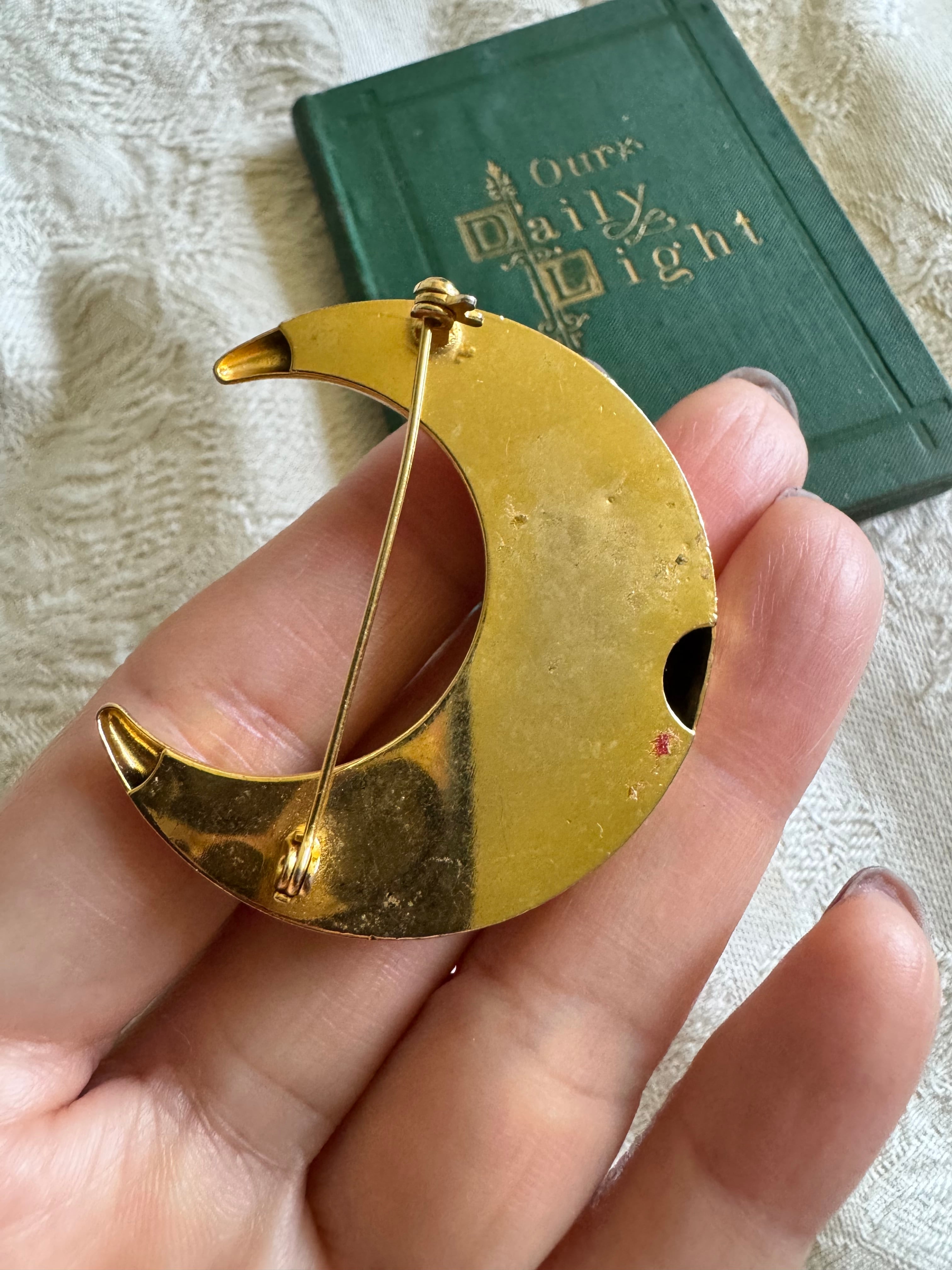 ■幻想的なデザインが魅力のブローチです!月と星が繊細に表現され、どんなコーディネートにも華やかさをプラスします。ヴィンテージの風合いがあり、特別な日の装いにもぴったり。普段使いでも、さりげなく存在感を放ちます。