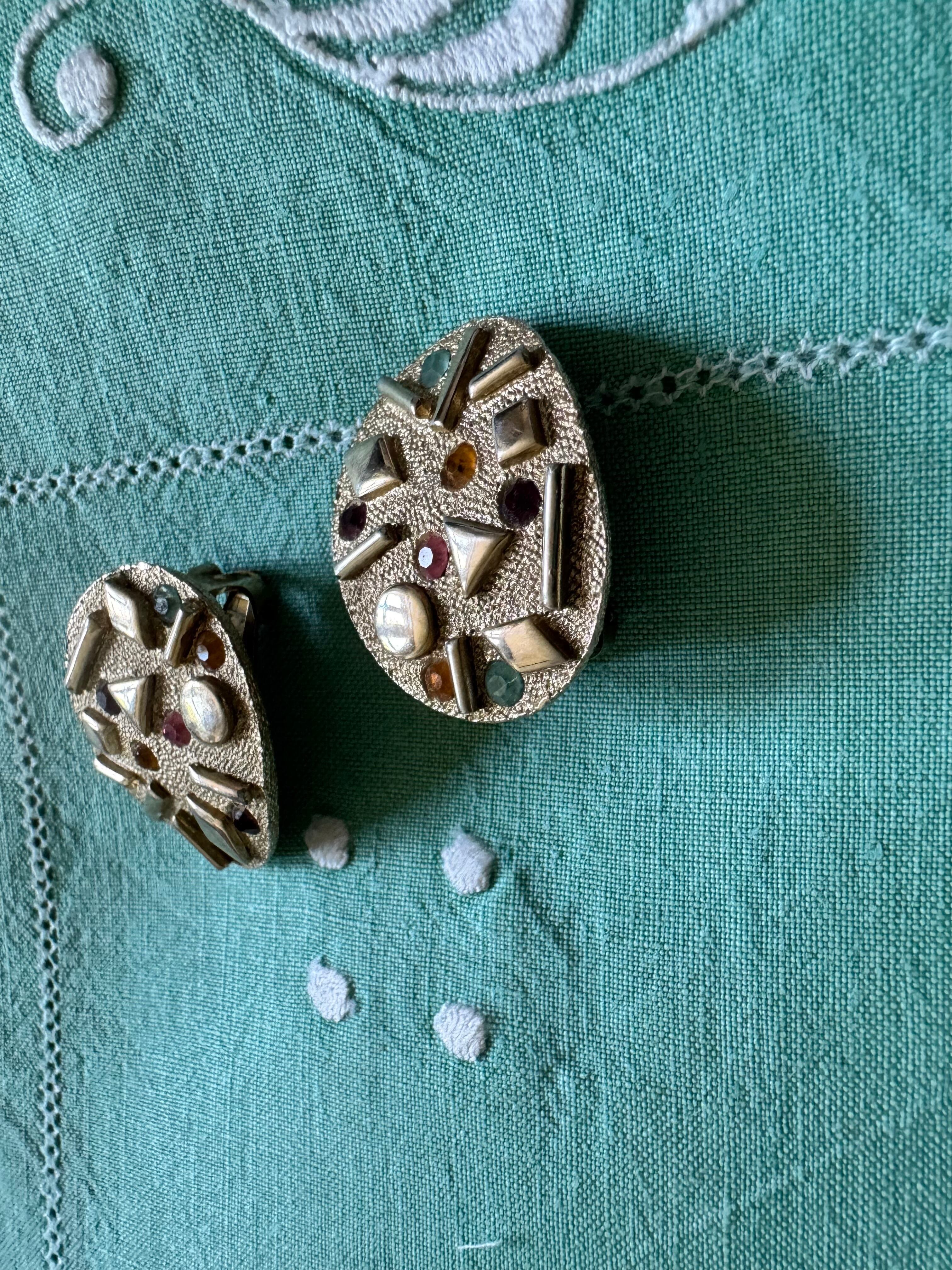 ■優美なパステルビジューが特徴のイヤリングです!柔らかな色合いが華やかさを引き立て、どんなシーンでも注目を集めること間違いなし。ヴィンテージならではの独特な魅力が詰まっており、特別な日の装飾にもぴったり。普段使いにも、コーディネートに彩りを添えるアイテムとして大活躍します。