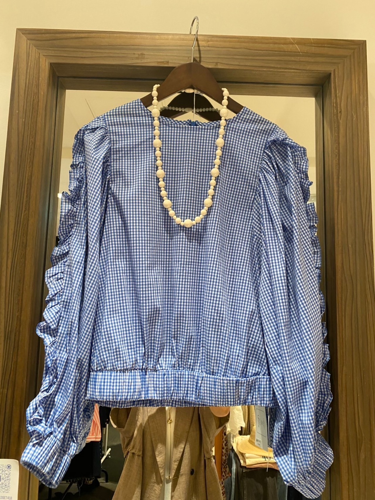 ■爽やかなブルーのギンガムチェック袖フリルブラウスは、レトロ感と華やかさを兼ね備えた魅力的なアイテムです。
