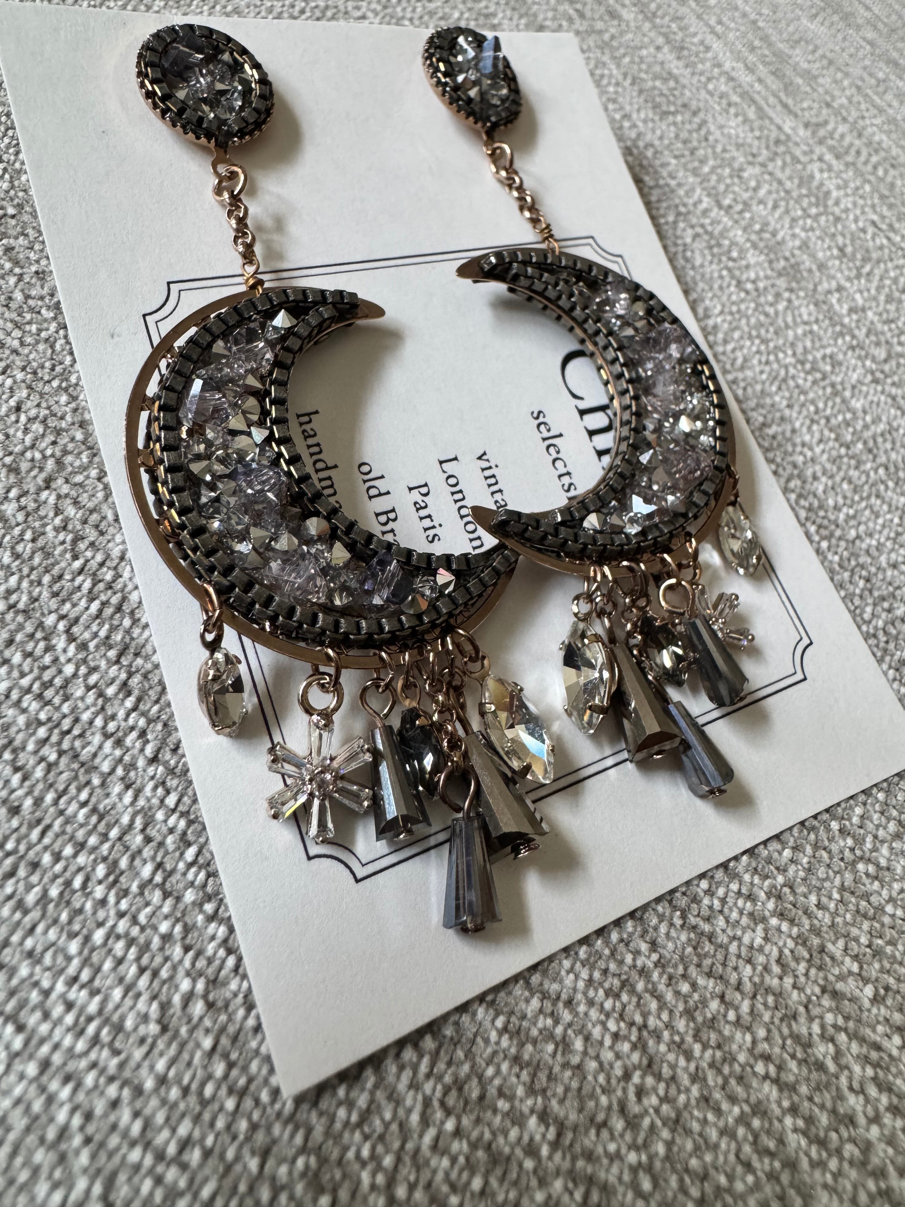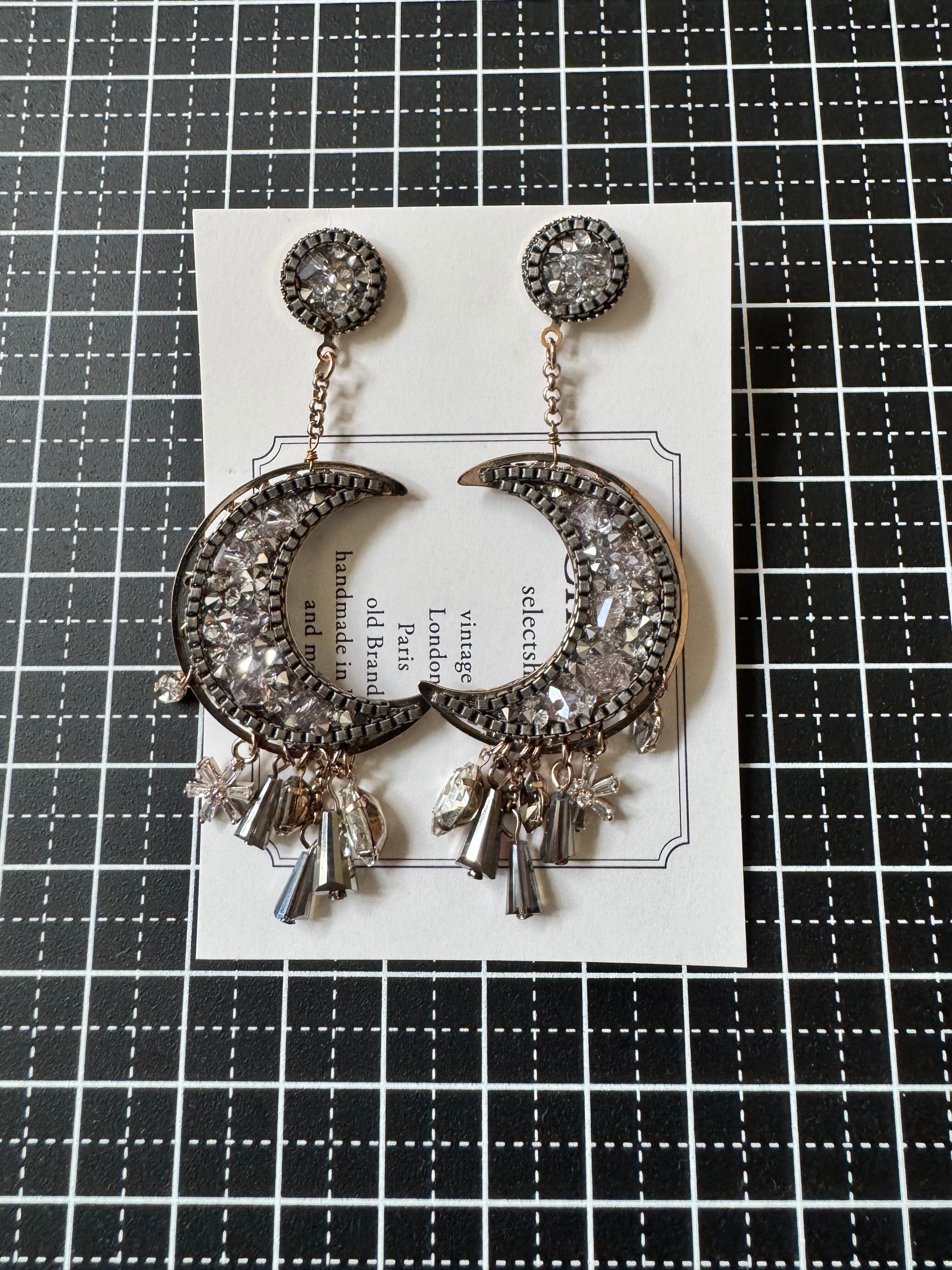 この美しい月のビジューピアスは、幻想的なデザインと上品な輝きを兼ね備えたアイテムです!月をモチーフにした独特なフォルムが、あなたの耳元に神秘的な印象を与えます。キラキラとしたビジューがさりげなく光り、どんなシーンでも華やかさを演出します。