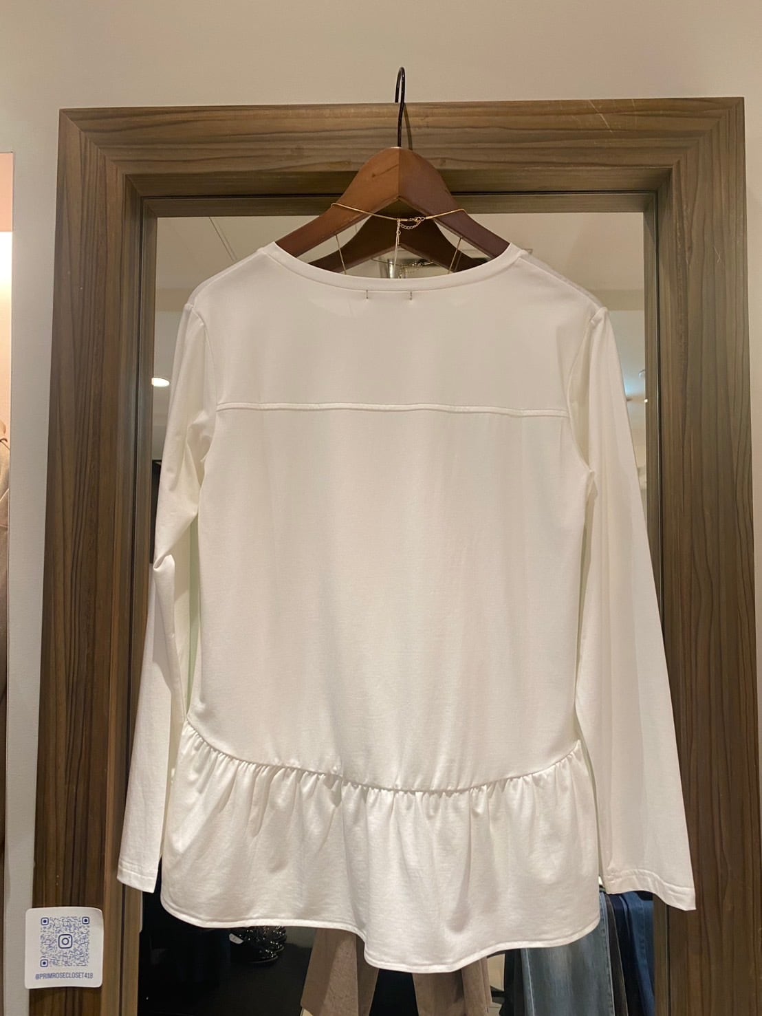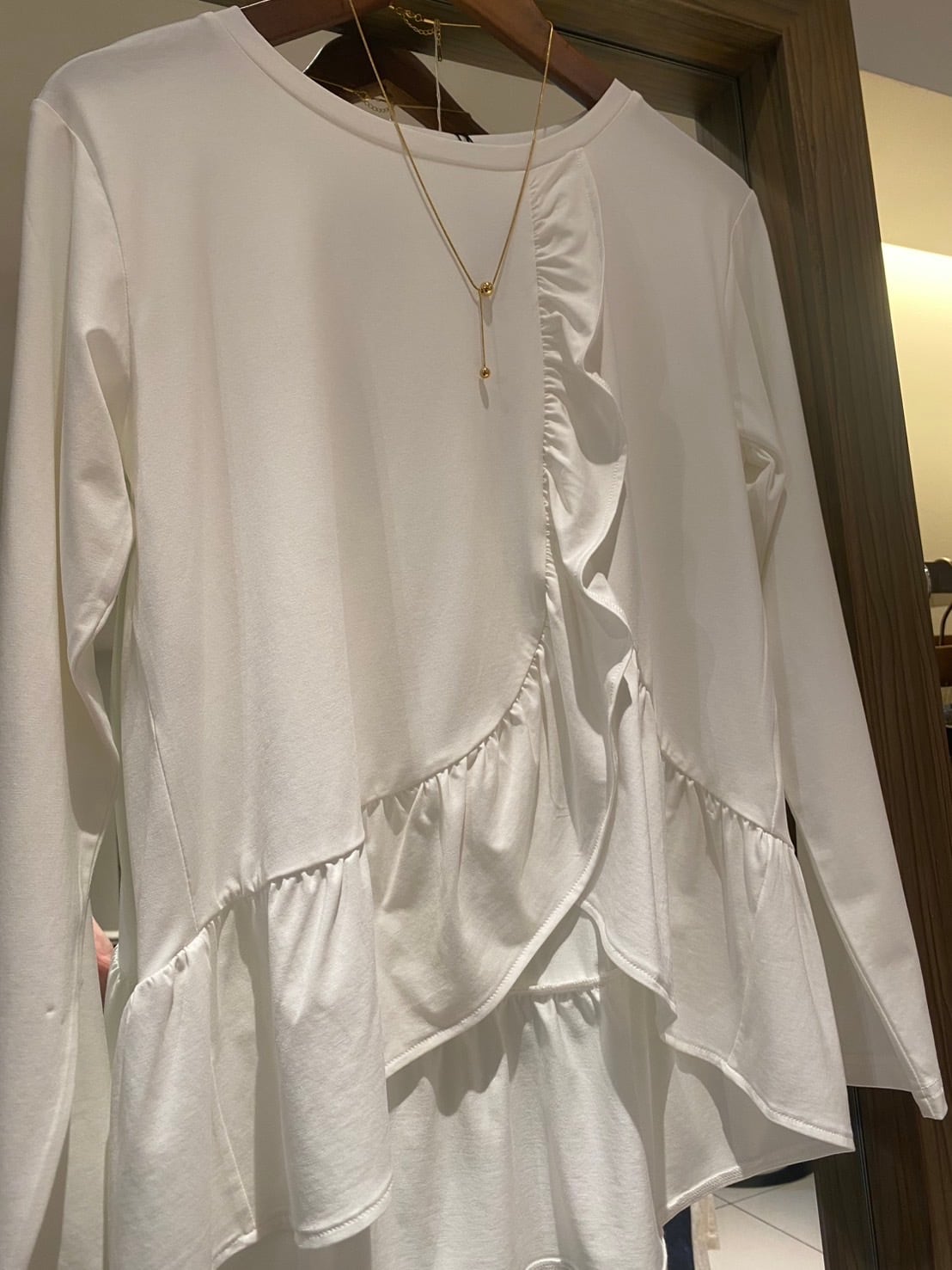 このフリルカットソーは、柔らかな素材感とふんわりとしたフリルデザインが特徴です。