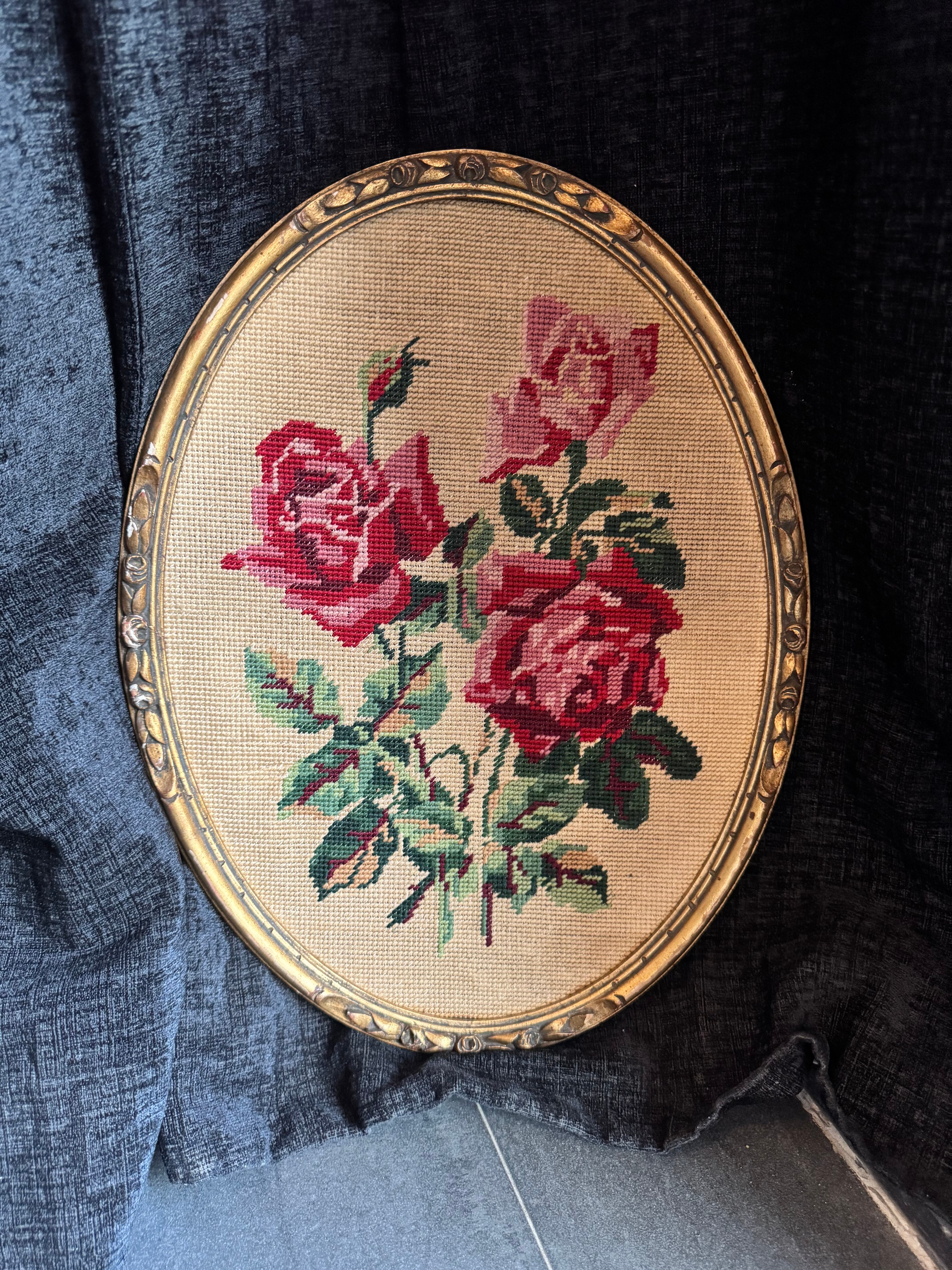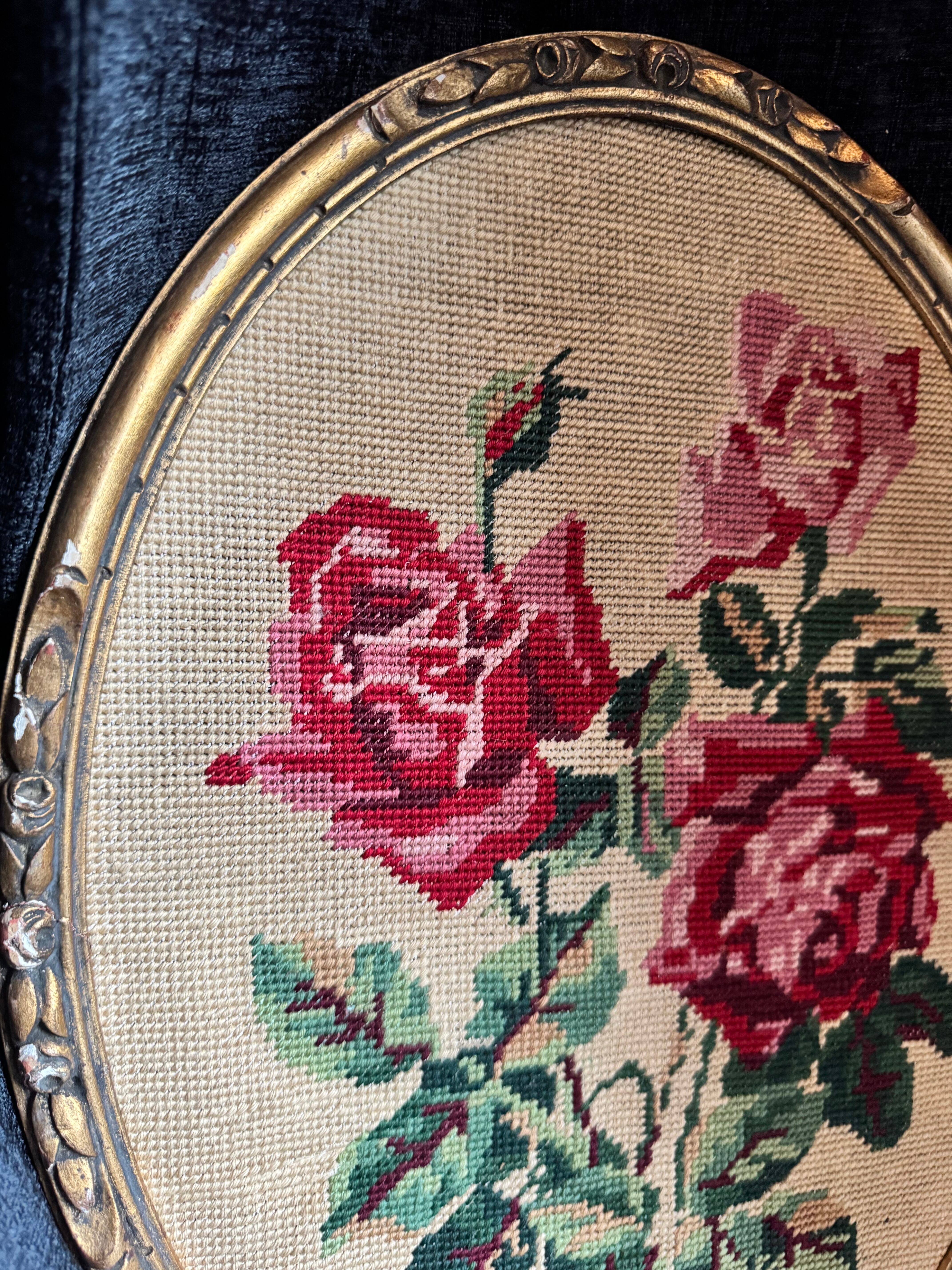 België クロスステッチ薔薇の刺繡のオーバル額入り