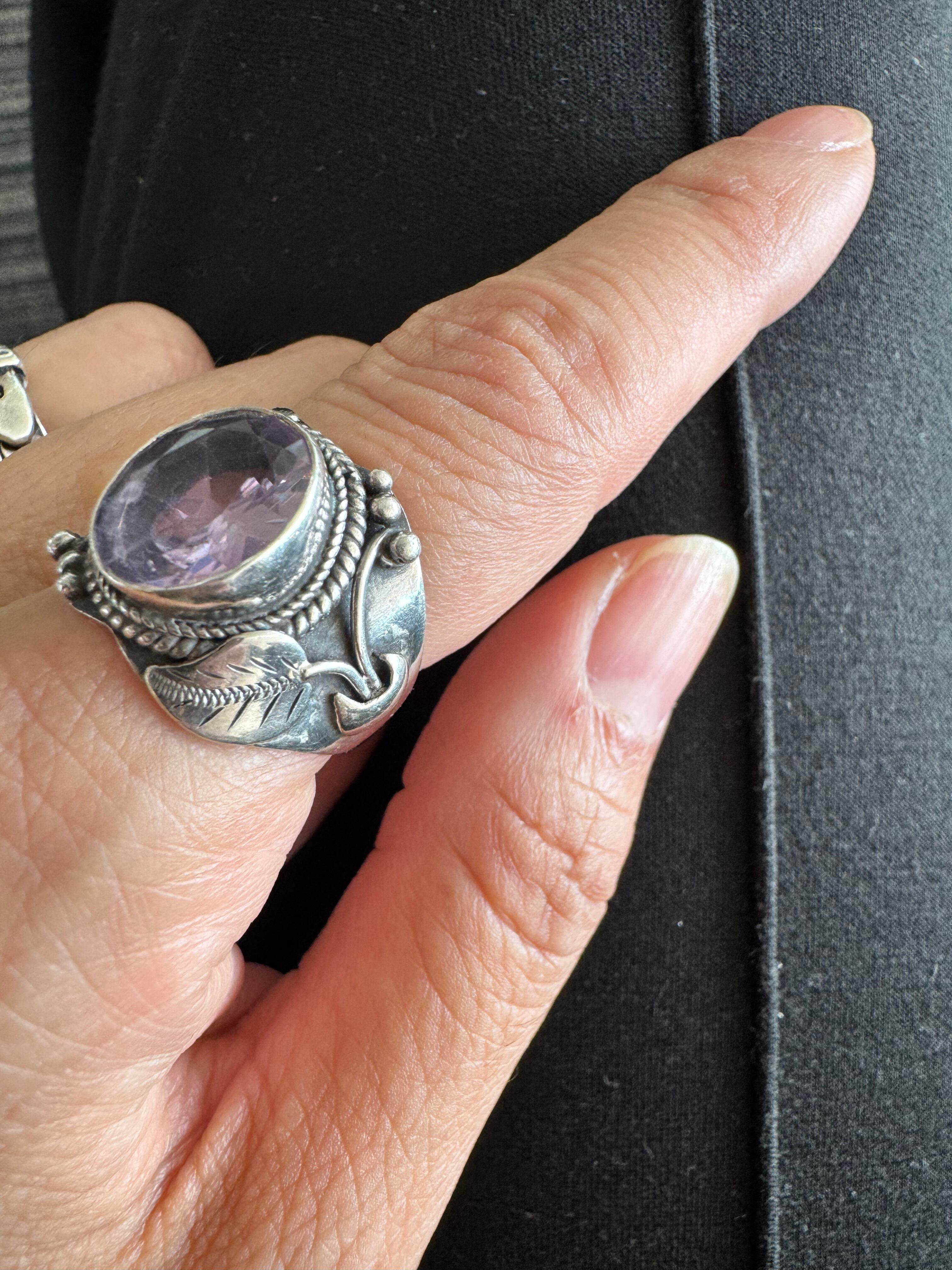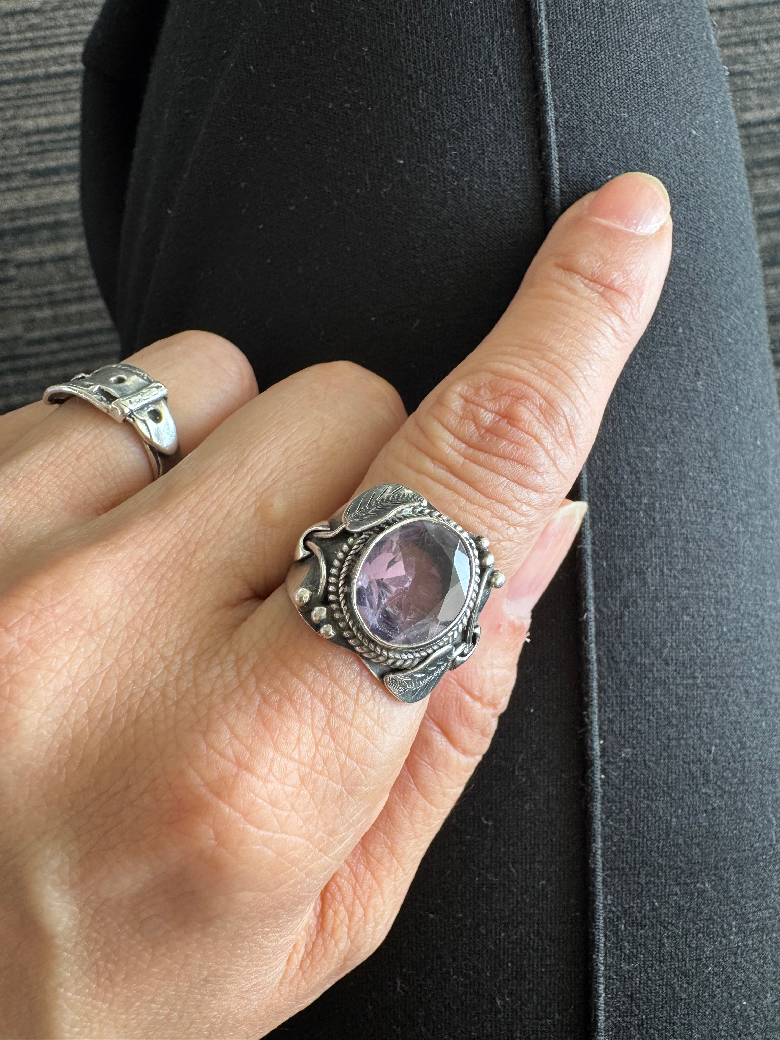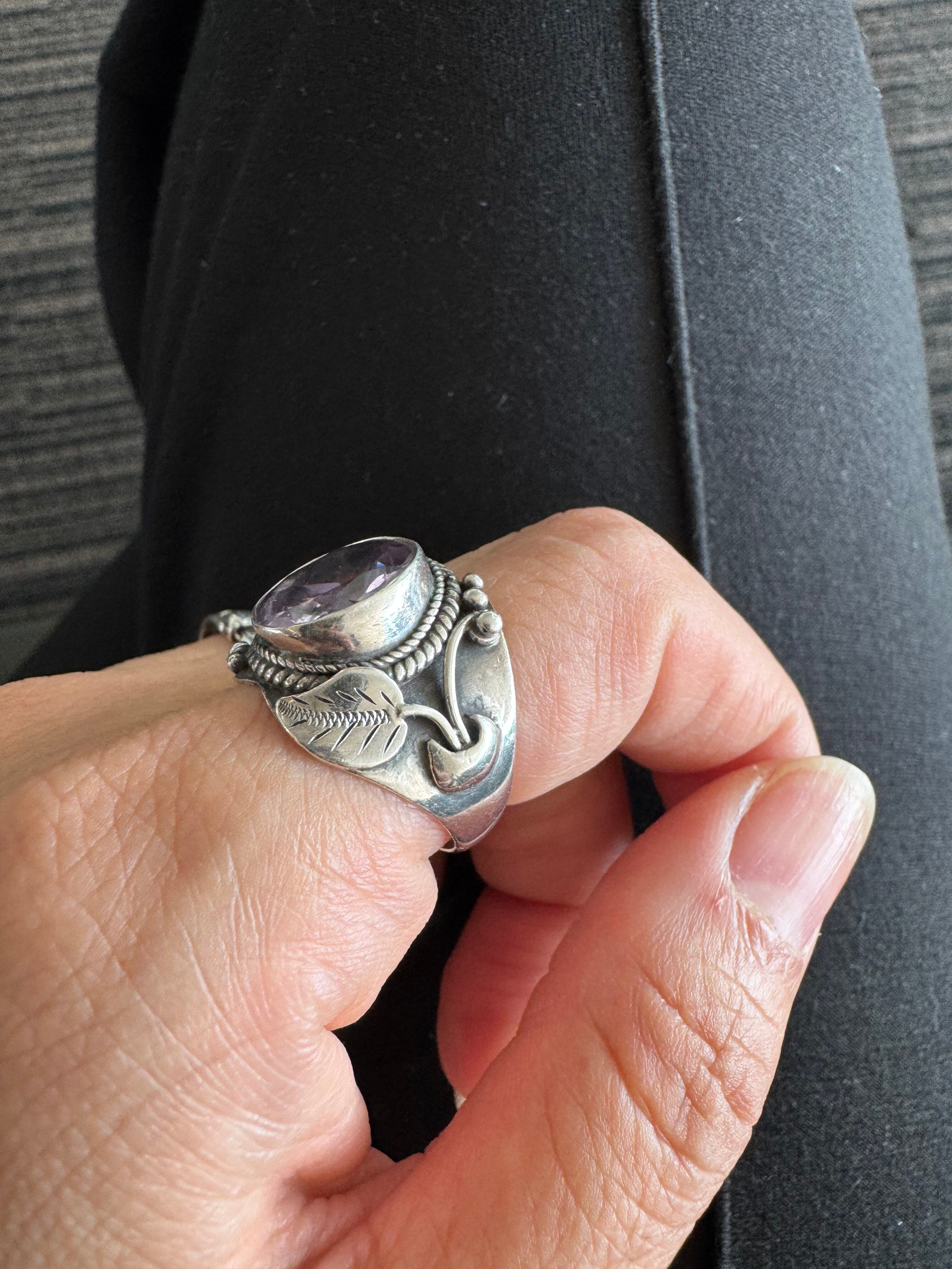 このBelgië vintage silver ボタニカルシルバーデザインアメジストは、自然の美しさを取り入れたボタニカルモチーフのヴィンテージアイテムです。シルバーの輝きとアメジストの深い紫色が絶妙に調和し、指元で華やかさを演出します。身に着けることで、あなたのスタイルに個性的なインパクトを与えます。