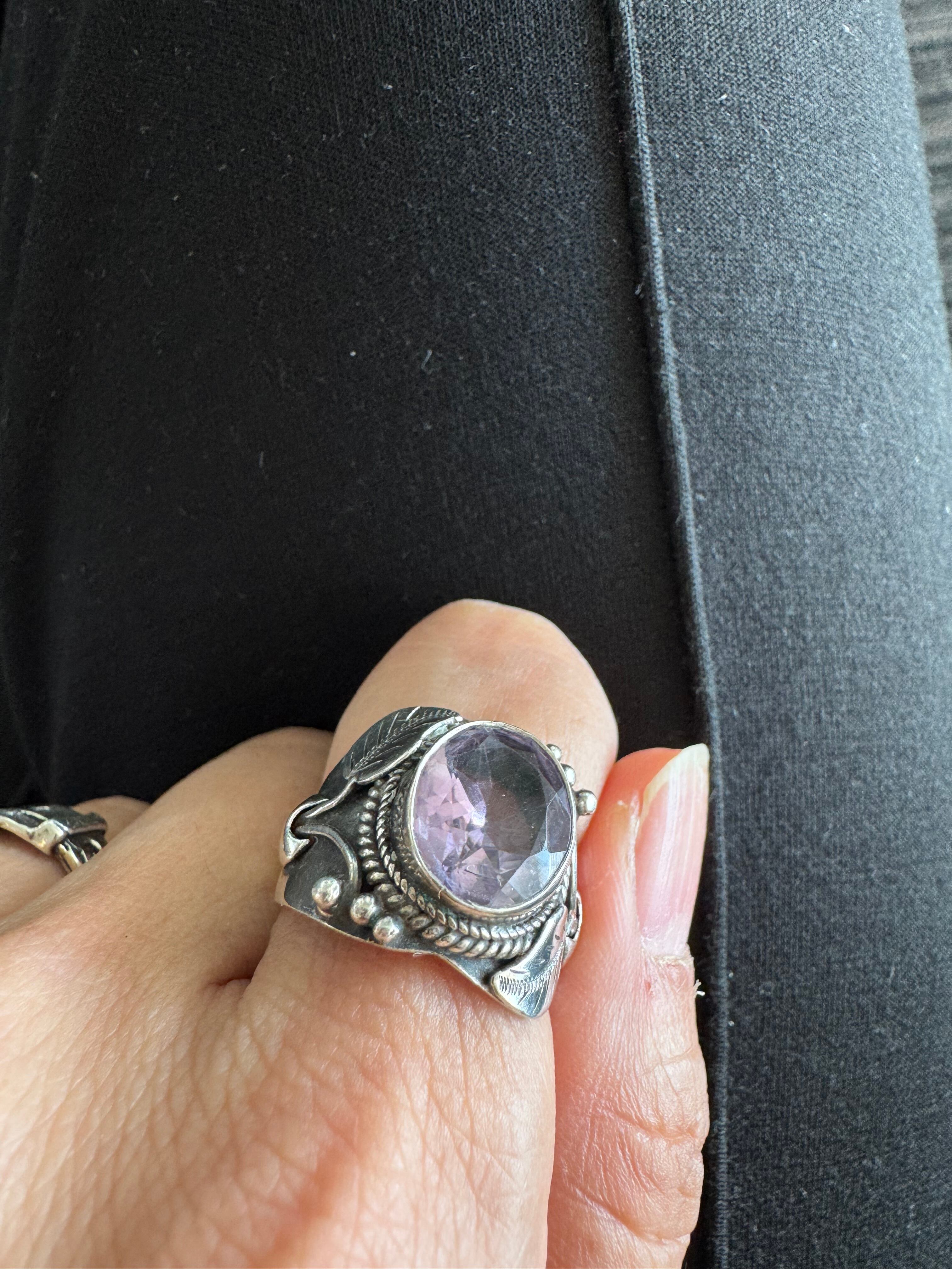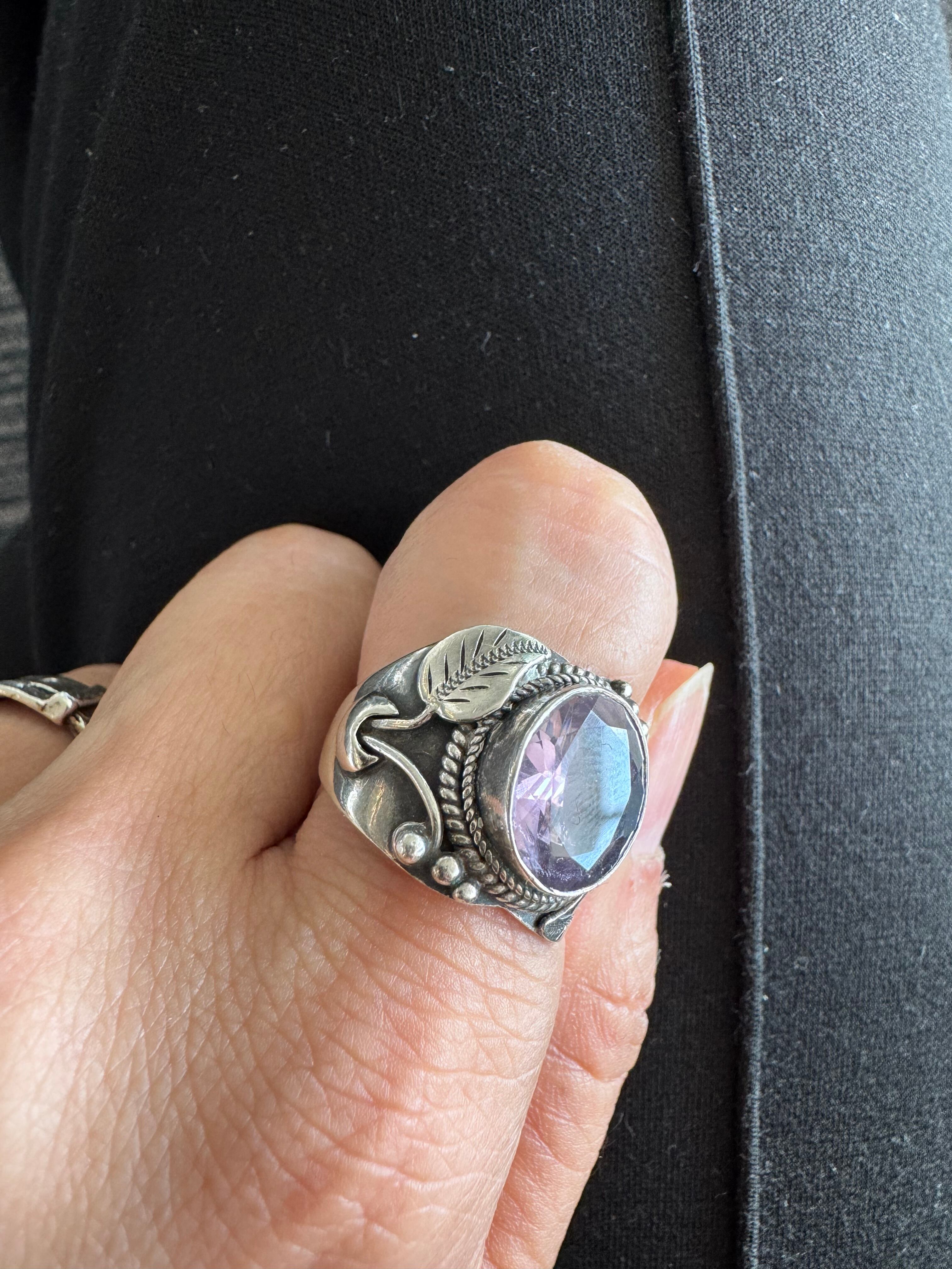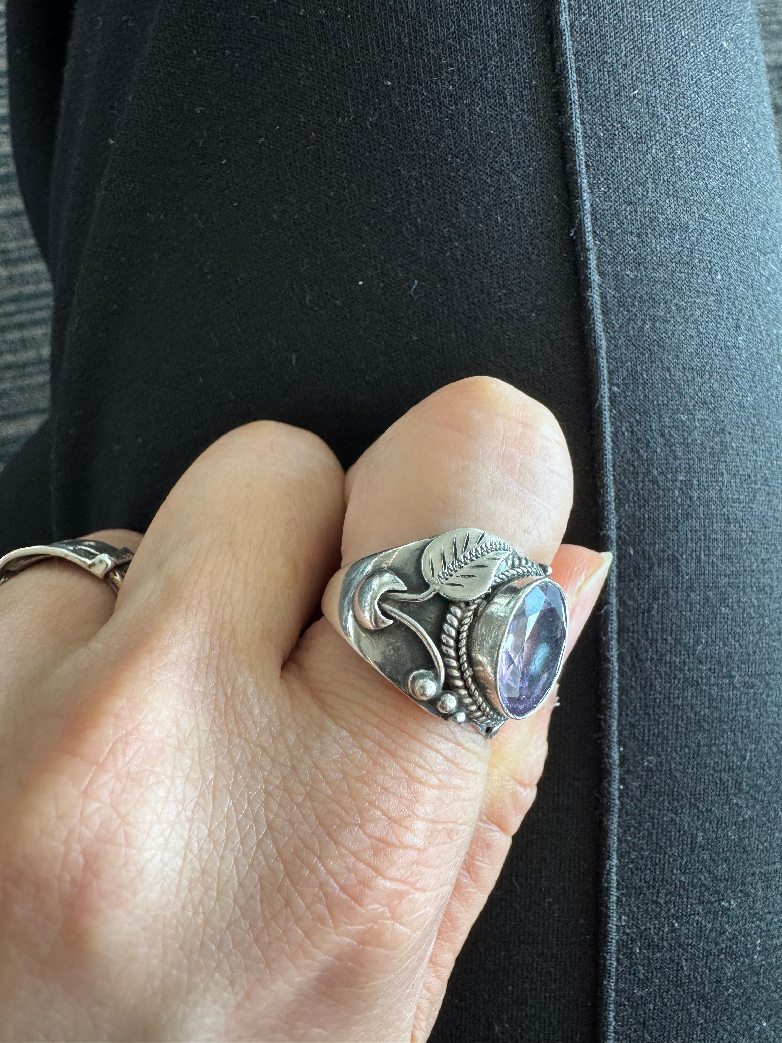 このBelgië vintage silver ボタニカルシルバーデザインアメジストは、自然の美しさを取り入れたボタニカルモチーフのヴィンテージアイテムです。シルバーの輝きとアメジストの深い紫色が絶妙に調和し、指元で華やかさを演出します。身に着けることで、あなたのスタイルに個性的なインパクトを与えます。