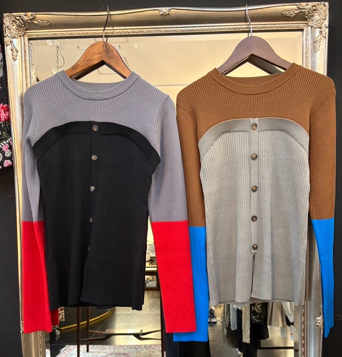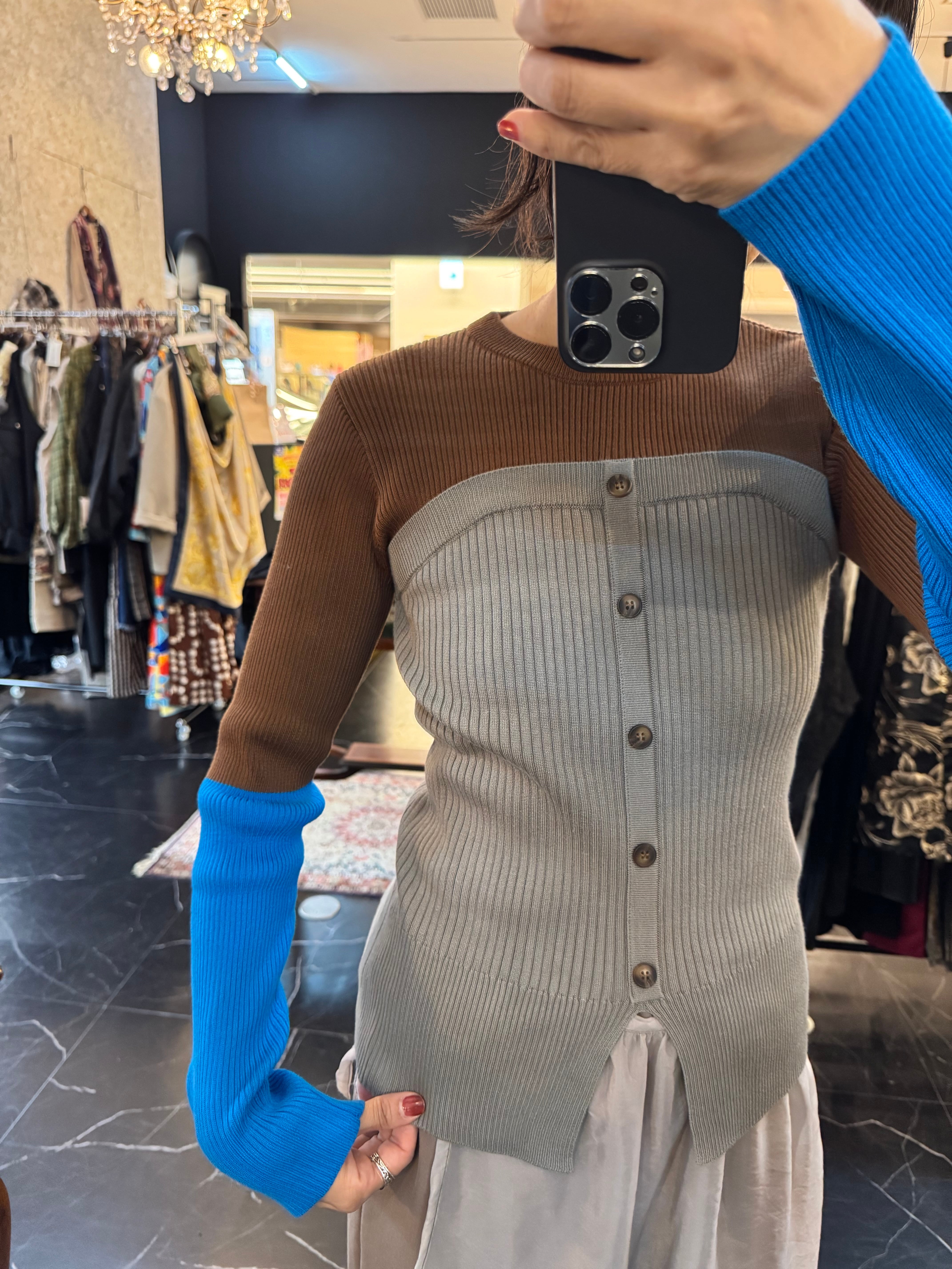 この配色リブニットは、個性的な配色と心地よい着用感が魅力的な一品です。リブ編みのデザインが、ユニークなスタイルを引き立て、日常のコーディネートに新鮮なアクセントを加えてくれることでしょう。