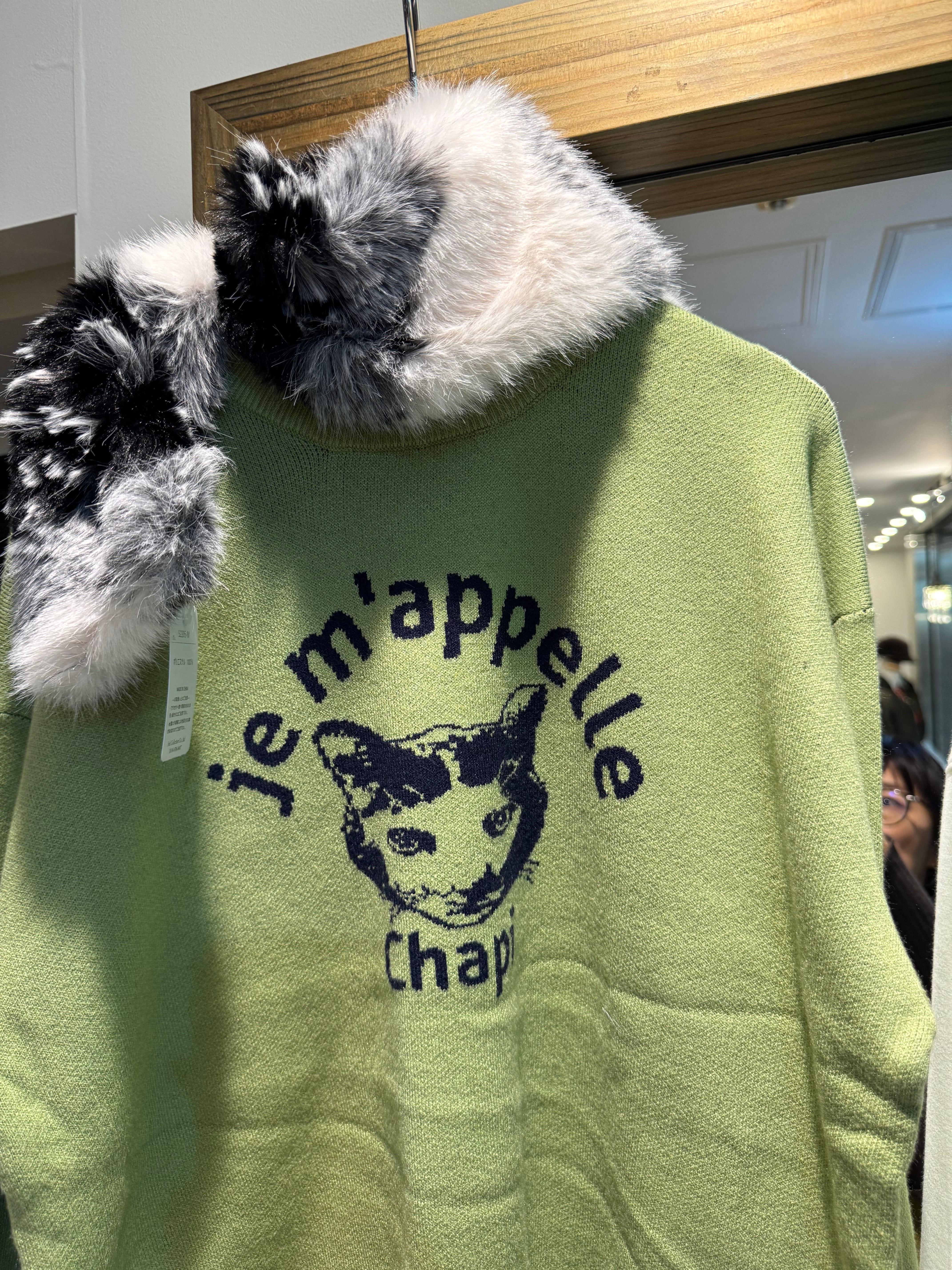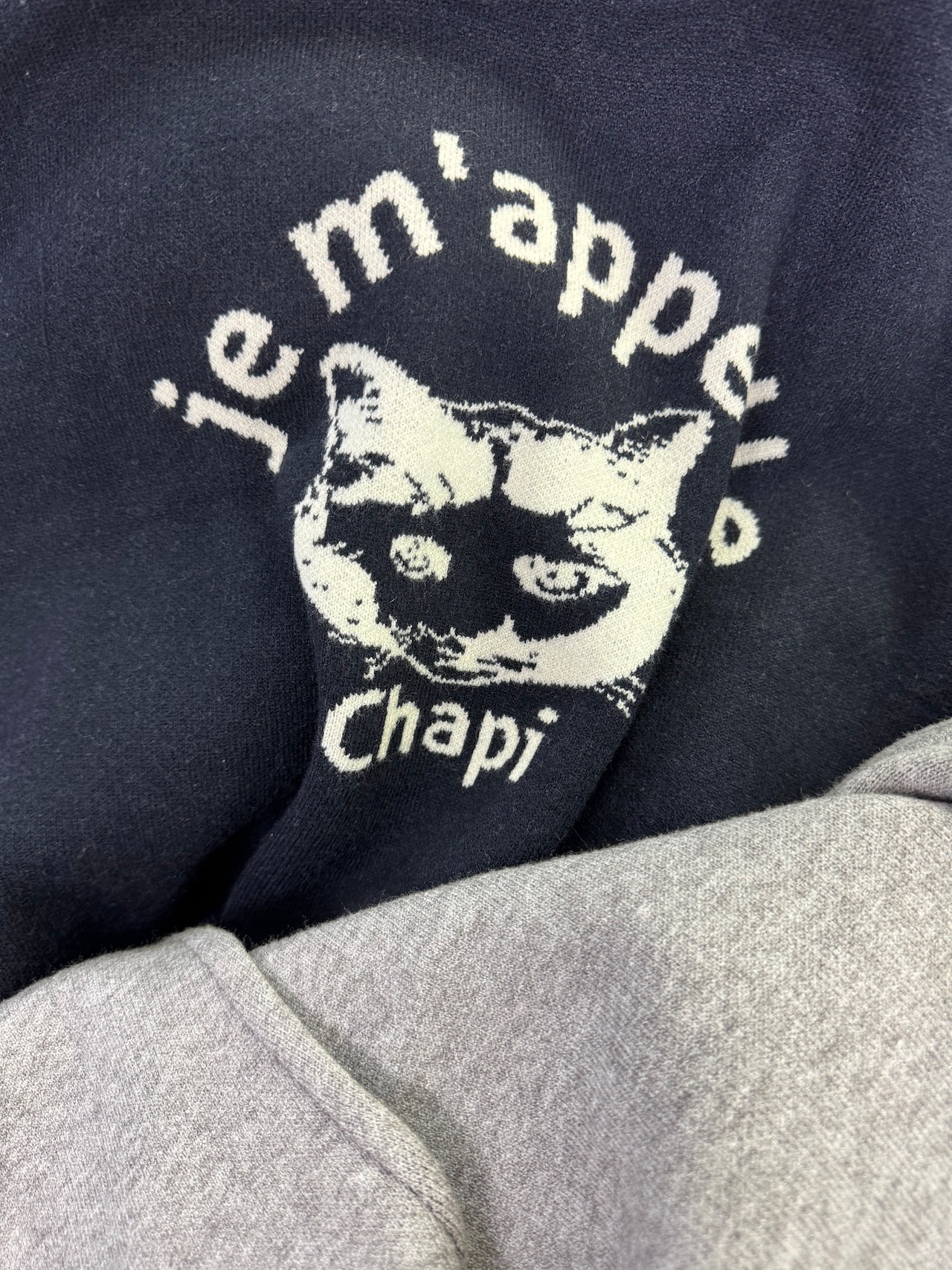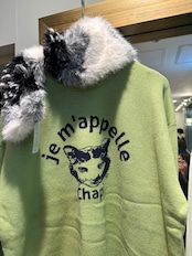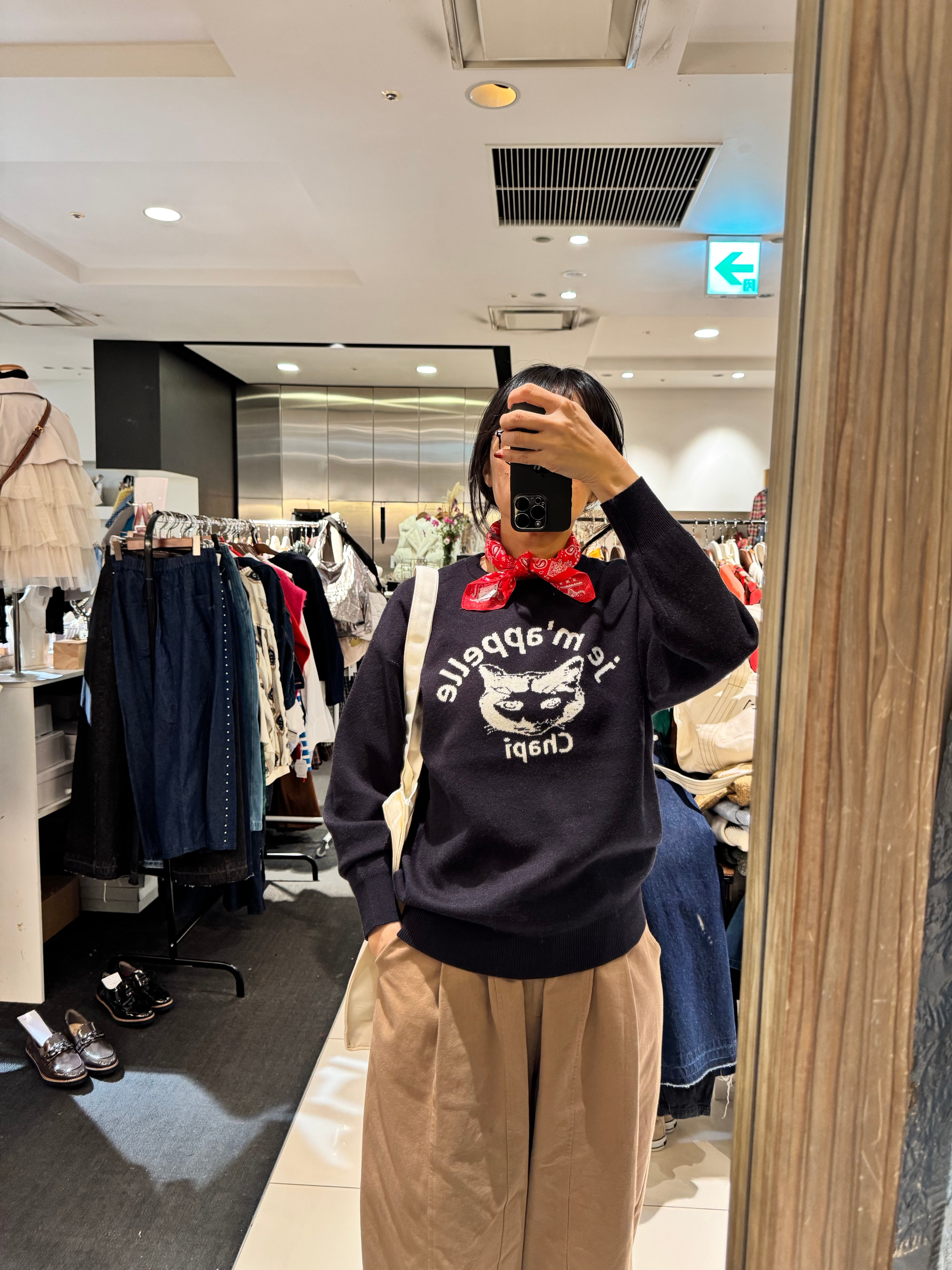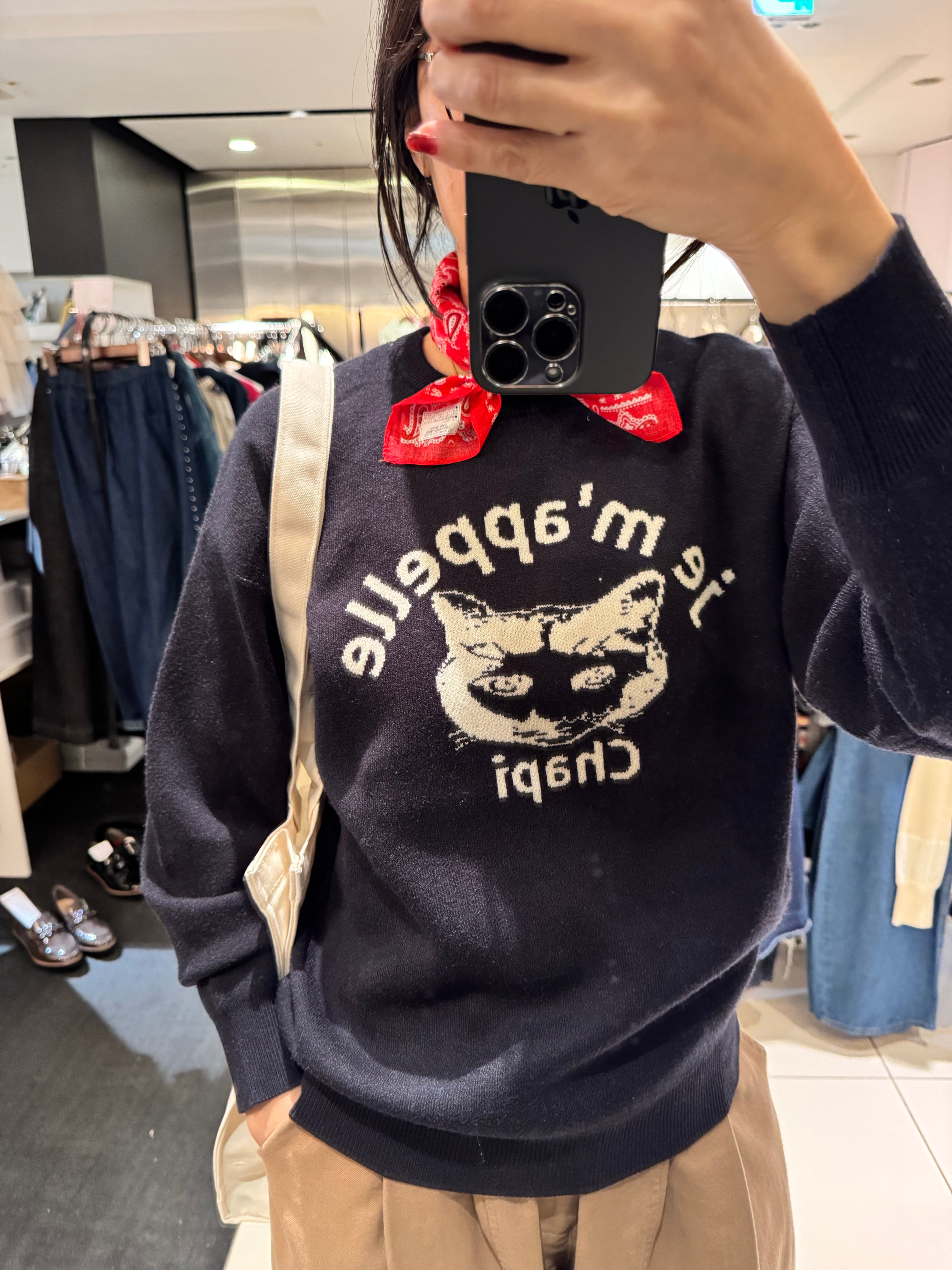 このニットは、個性的な猫の刺繍が特徴で、シンプルながら目を引くデザインが魅力です。普段使いはもちろん、大切な猫好きの友人へのプレゼントにも最適な一着です。この猫ニットが、あなたのワードローブをより楽しく彩ってくれることを願っています。