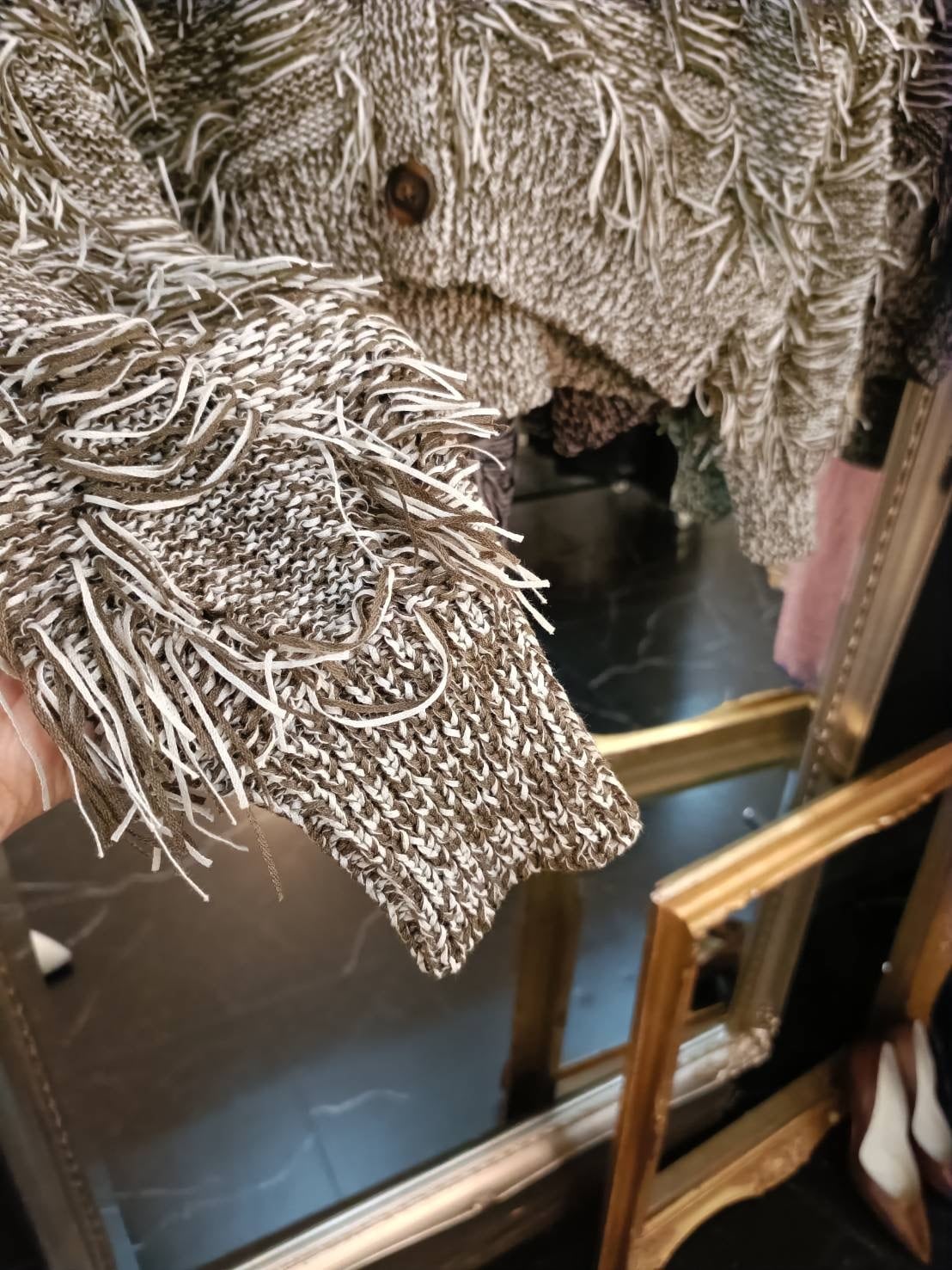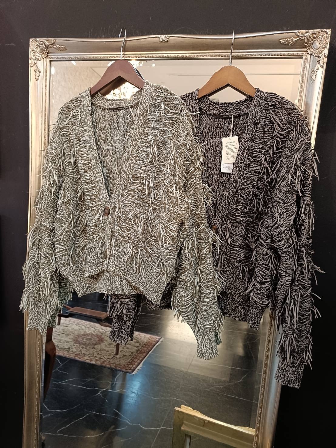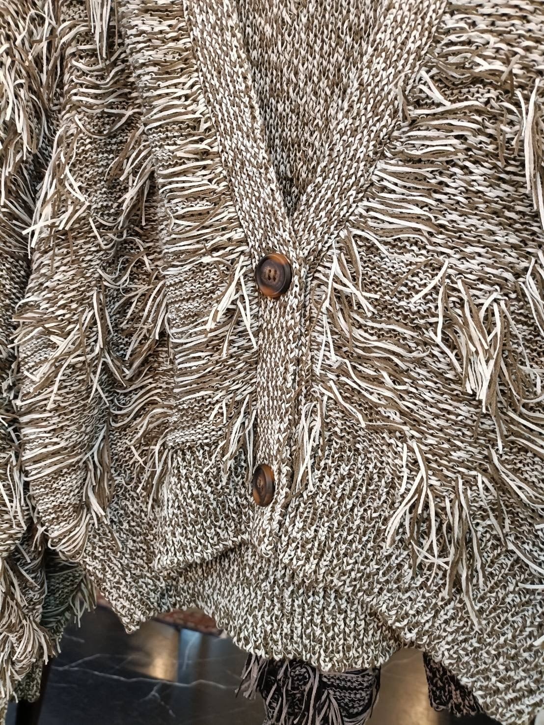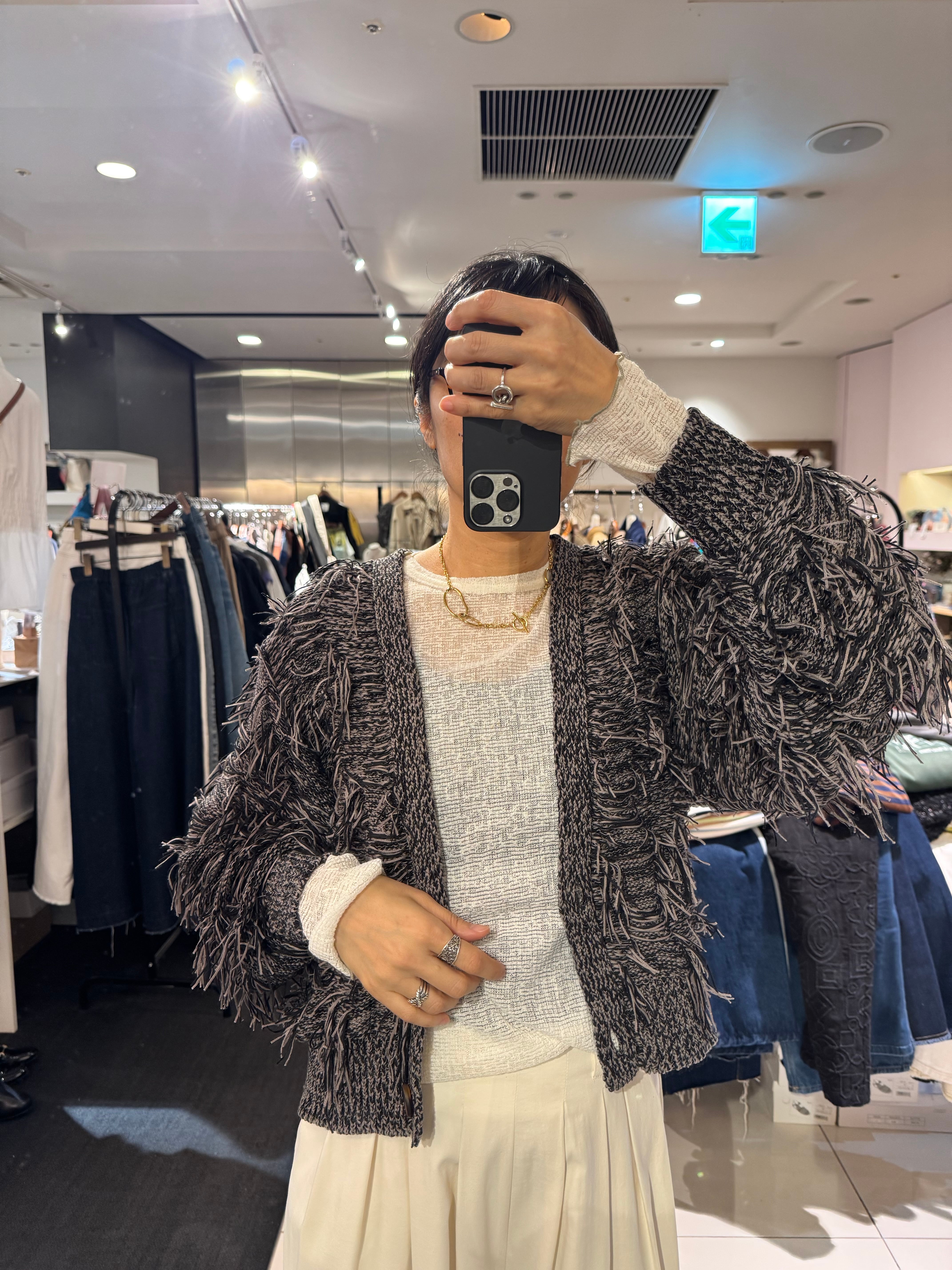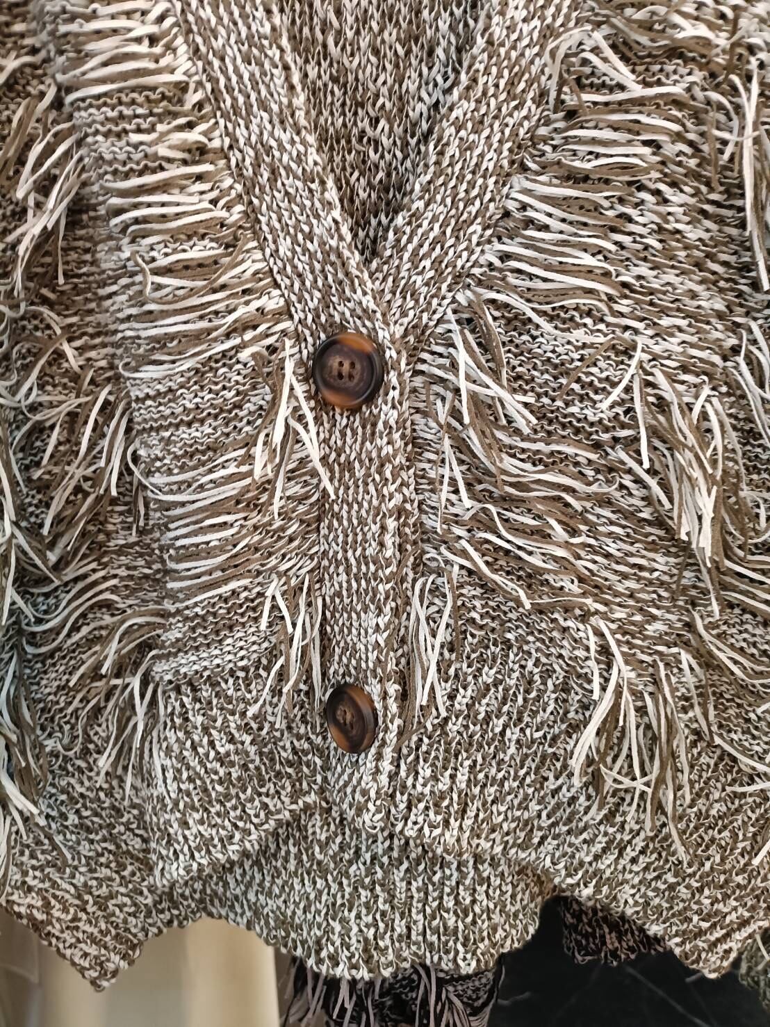 リボンを編んでフリンジたっぷりで仕上げた可愛いカーディガン