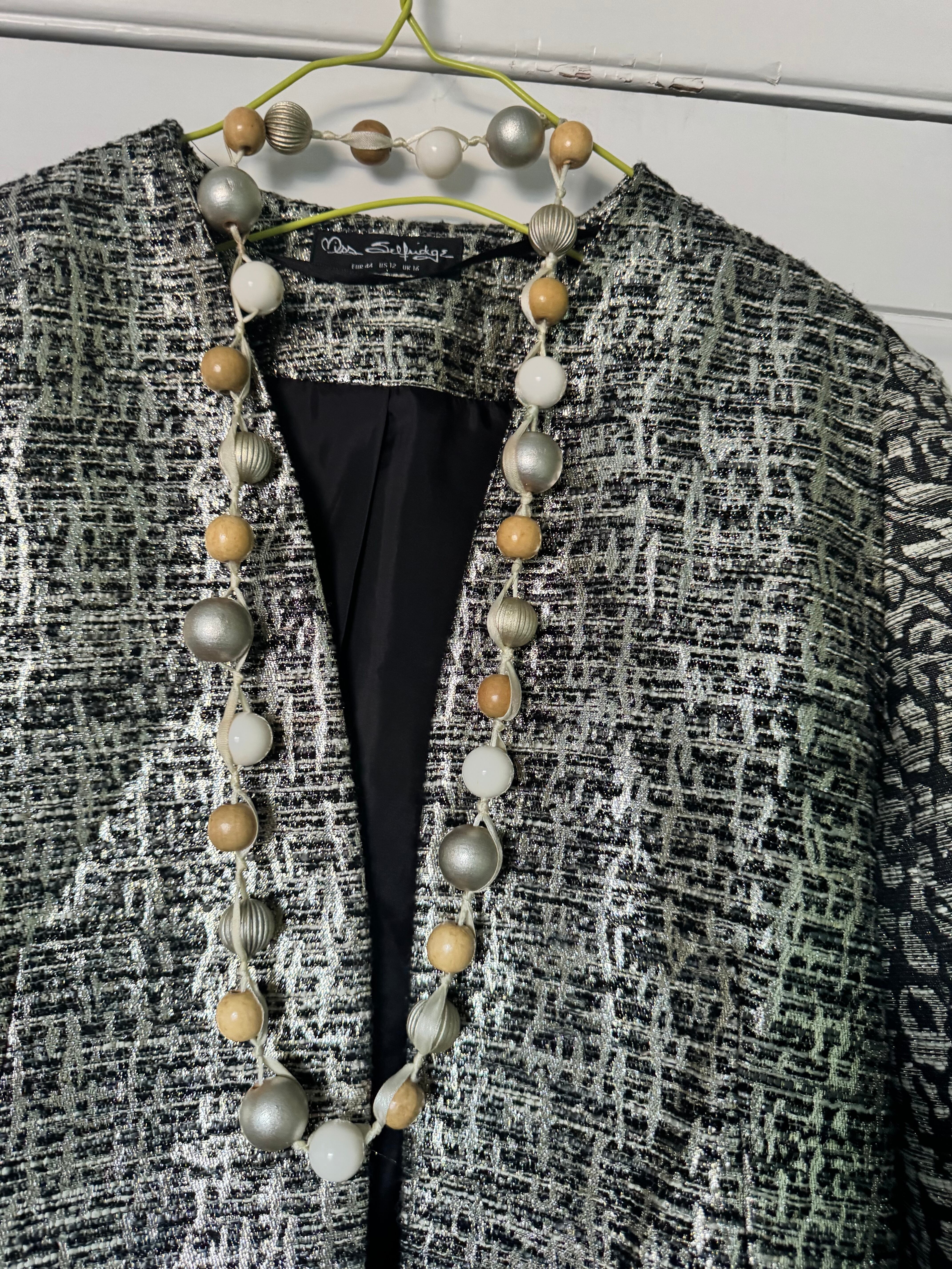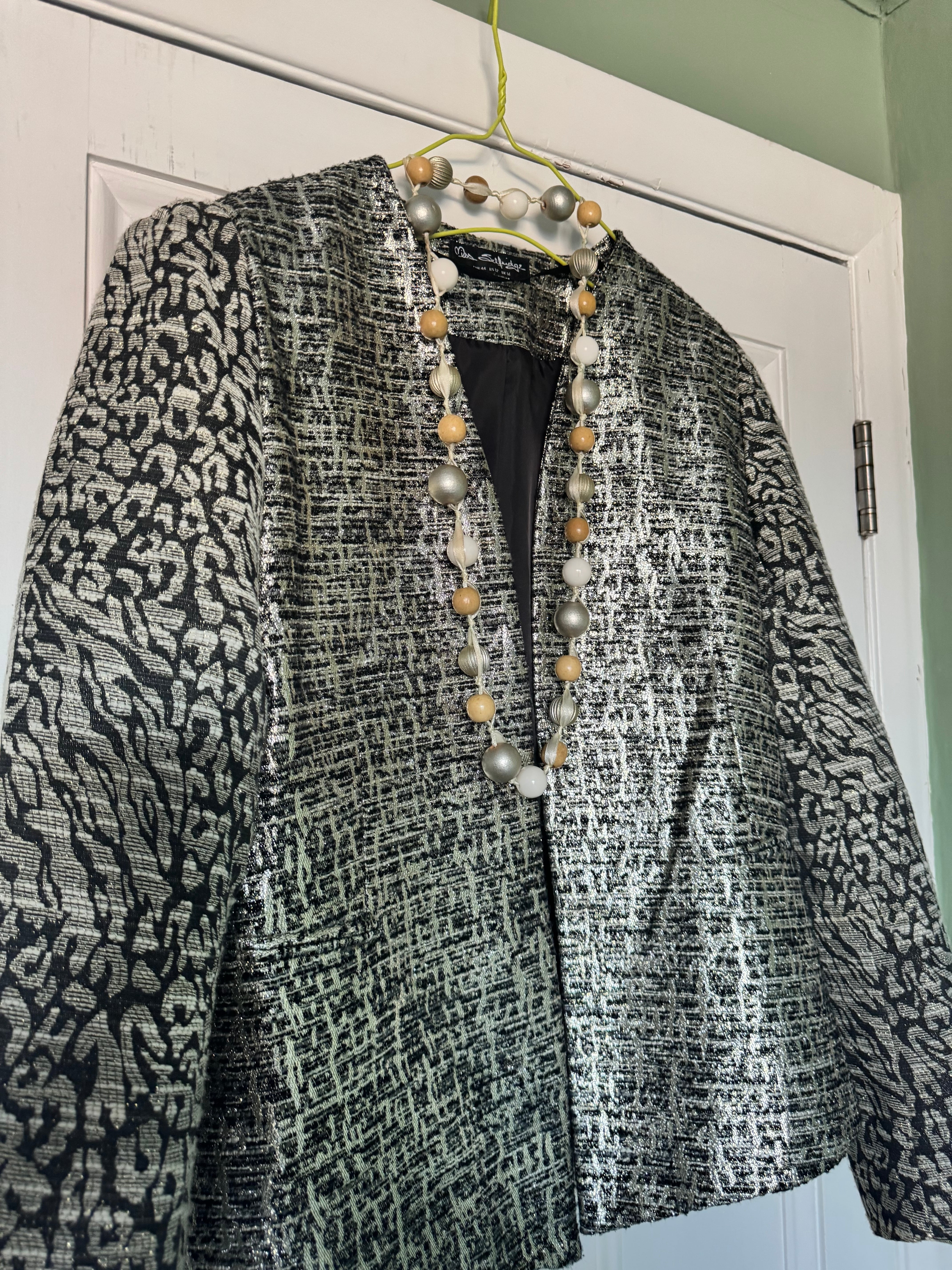 このLONDON vintage メタリック豹柄ジャケットは、ユニークなメタリックの豹柄が印象的な特別なアイテムです。光を浴びると輝く素材感が、あなたのスタイルに一層のアクセントを加えます。カジュアルな日常使いや特別なイベントまで、幅広いシーンで活躍することでしょう!